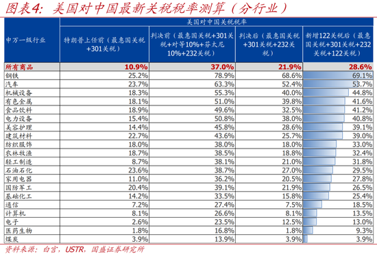 4、若按照新增15%关税计算,美国对中国关税税率降8.4个百分点至28.6%,对美出口可能反弹9.1%,总出口增加0.6%。分行业看,计算机、国防军工、机械设备、电子、电力设备行业关税降幅最高,在10%-13%之间。