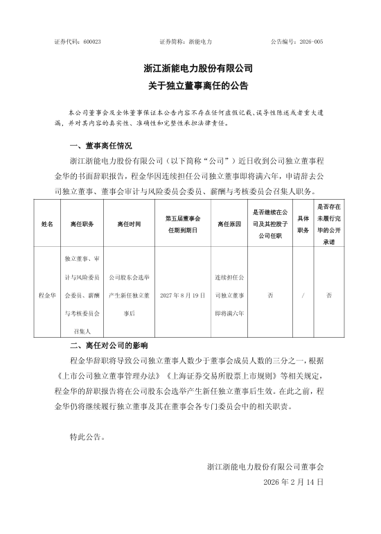 2月14日,浙能电力公告称,公司近日收到公司独立董事程金华的书面辞职报告,程金华因连续担任公司独立董事即将满六年,申请辞去公司独立董事、董事会审计与风险委员会委员、薪酬与考核委员会召集人职务。